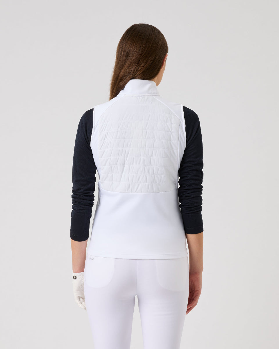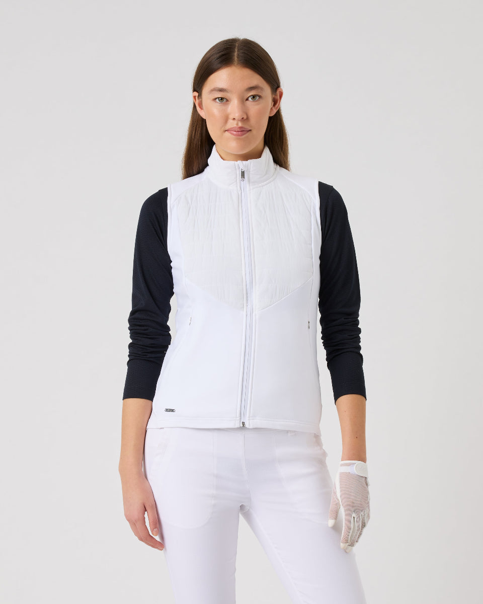 The Allos Hybrid Vest blends understated elegance with functional design. Made from stretch micro light jersey, this versatile golf vest ensures quick-dry moisture management, complemented by quilted wind-resistant fabric on the chest and back. Its regular fit makes it a stylish and practical layer for any occasion.