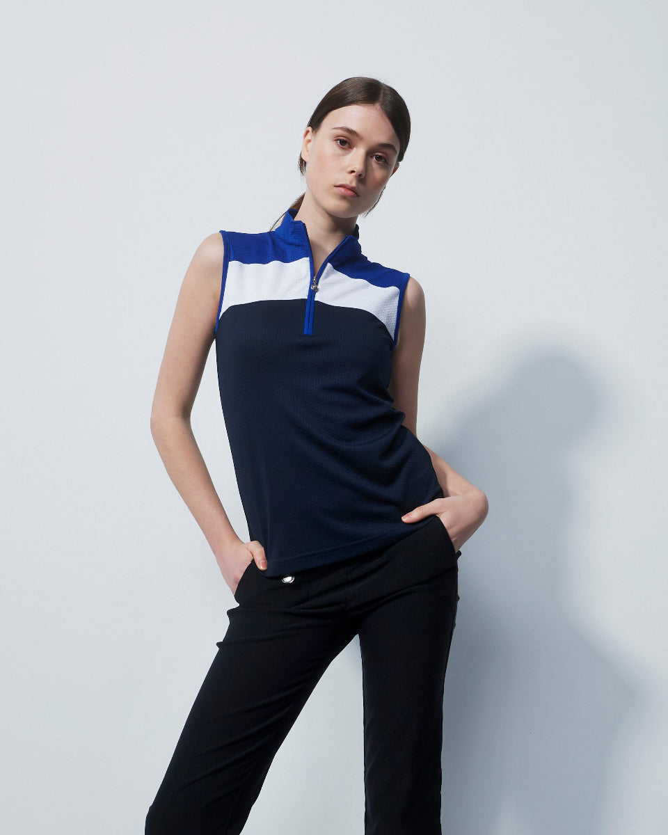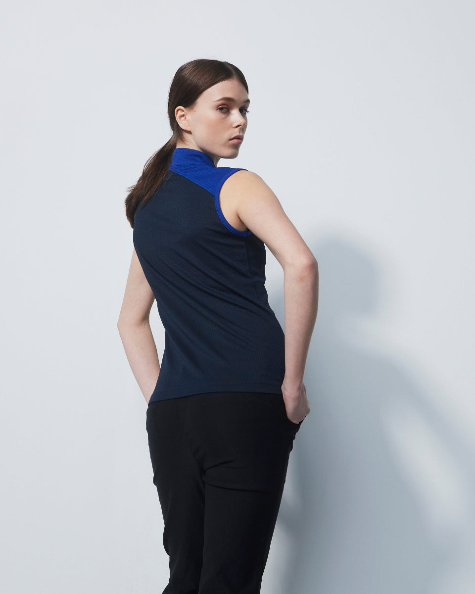This is a sleeveless golf top in a sporty design. The solid color is broken up by block panels across the shoulders and stand-up collar. The fabric provides ventilation and effective moisture-wicking to keep you cool. An ideal choice for hot days out on the golf course.
