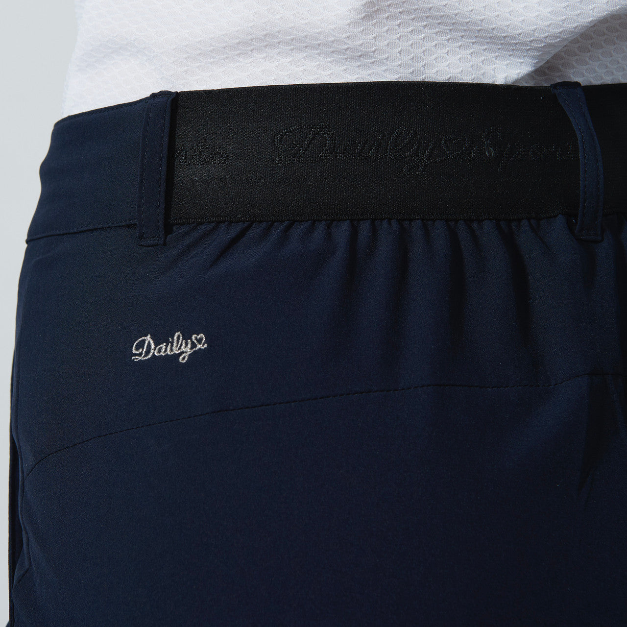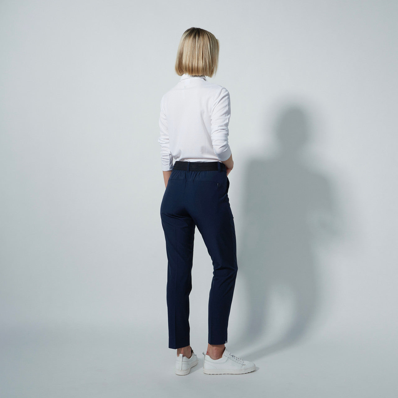 Beyond are flattering ankle-length pants with a straight fit. They provide a dressy look with a crease, a fly, two front side pockets and one rear pocket with zip. They are stretch fabric with an elasticated rear waistband. The lightweight fabric is made from recycled polyester and is wind-resistant, quick-dry and stays wrinkle-free.