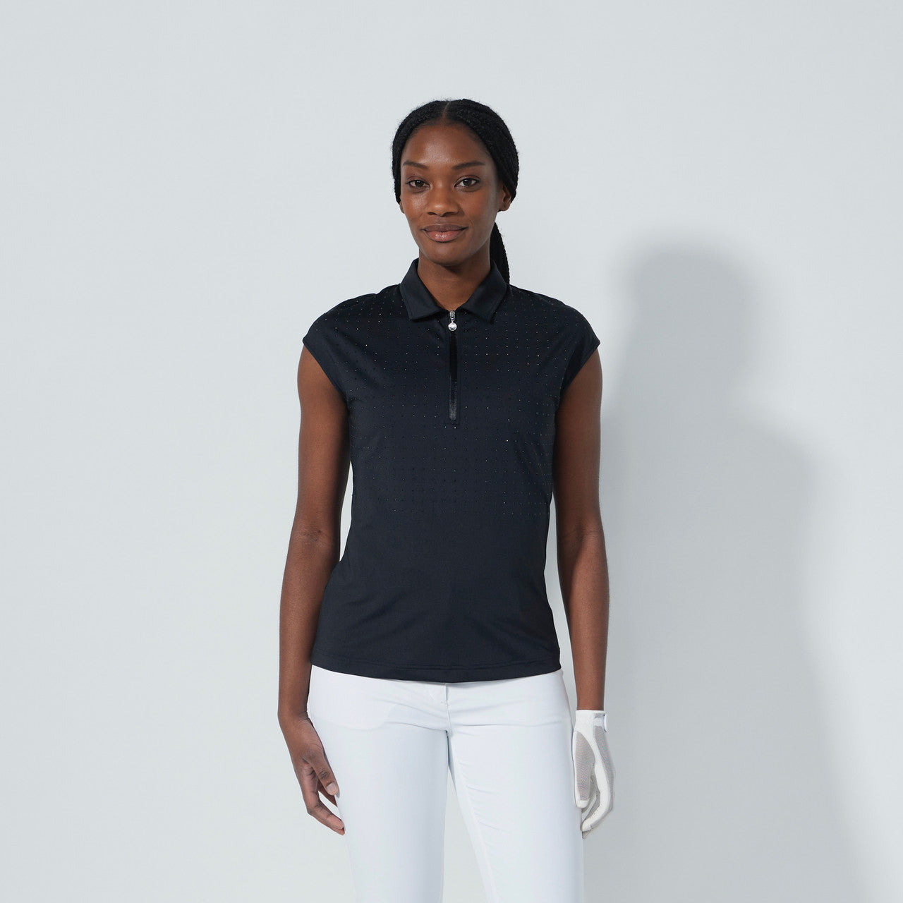 he Gaze cap sleeve shirt is an elegant polo that seamlessly blends design with style. Made from polyester and elastane, it offers a relaxed fit with added stretch for maximum comfort. Its single jersey material with rhinestones at front makes it a versatile choice for both the golf course and beyond.