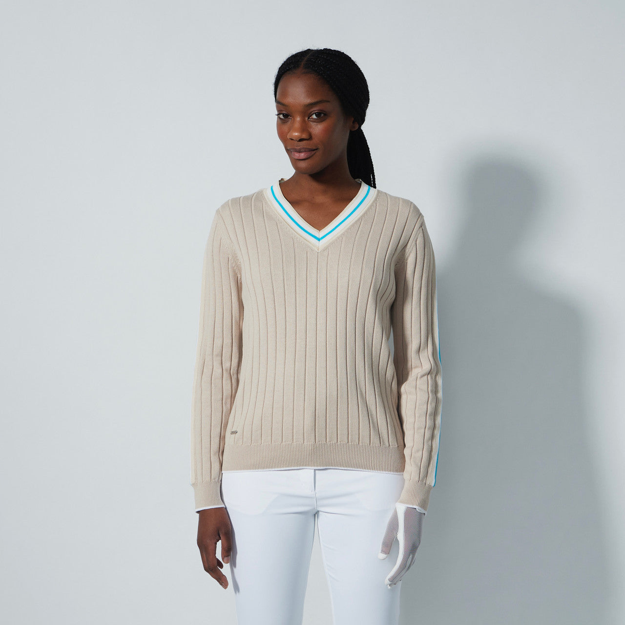 The Mairi pullover is a V-neck sweater in a timeless style, knitted in soft cotton. It has a relaxed fit, jacquard stripe on sleeves, and V-neck with stripe. A classic piece that lasts season after season.