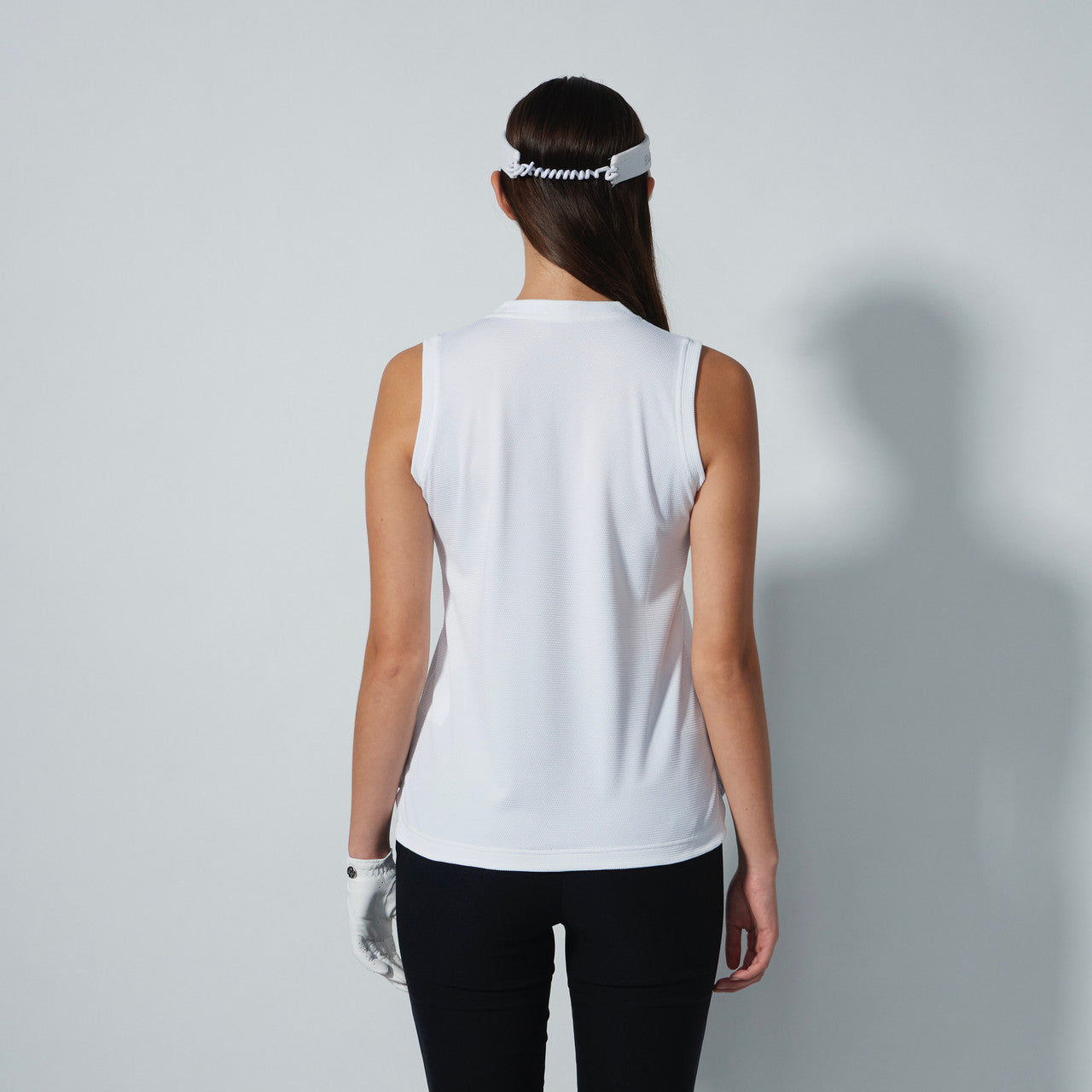 The Massy sleeveless top features an elegant V-neck design framed by a contrasting ribbon trim. The woven dobby fabric gives the top structure and character. The Massy has a relaxed fit and is made from a stretchy recycled material that breathes and dries quickly.