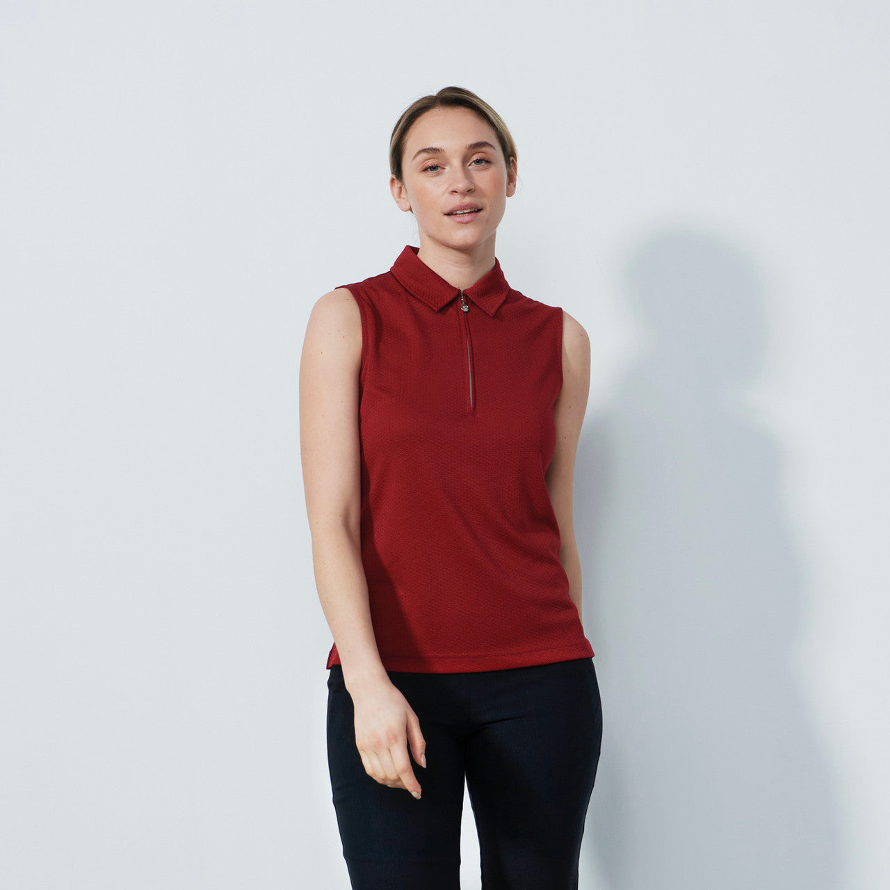 Peoria is a sophisticated sleeveless top with a neat collar, zip and jacquard-knit fabric that adds texture. It has a slightly fitted waist and is made from functional, recycled fabric that is moisture-wicking and keeps you cool.