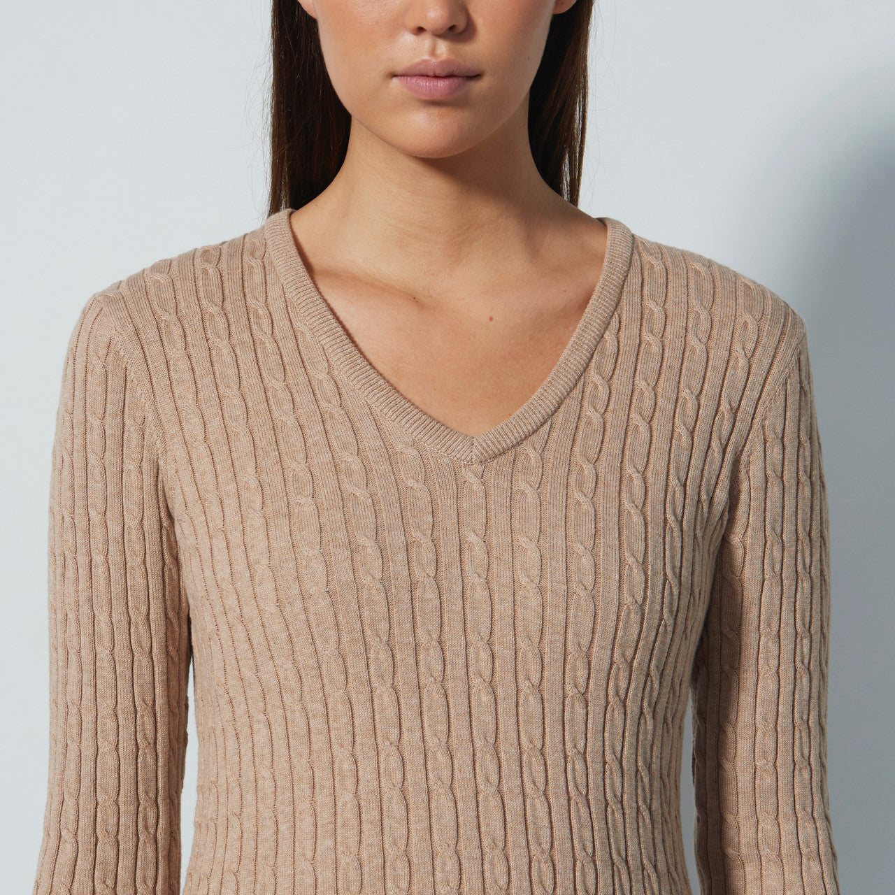 The Madelene is an exclusive golf sweater with a classic cable knit, V-neck and cuffs.  The sweater is made from a soft cotton material with 5% cashmere.  A timeless piece that works just as well on the golf course as in everyday life.