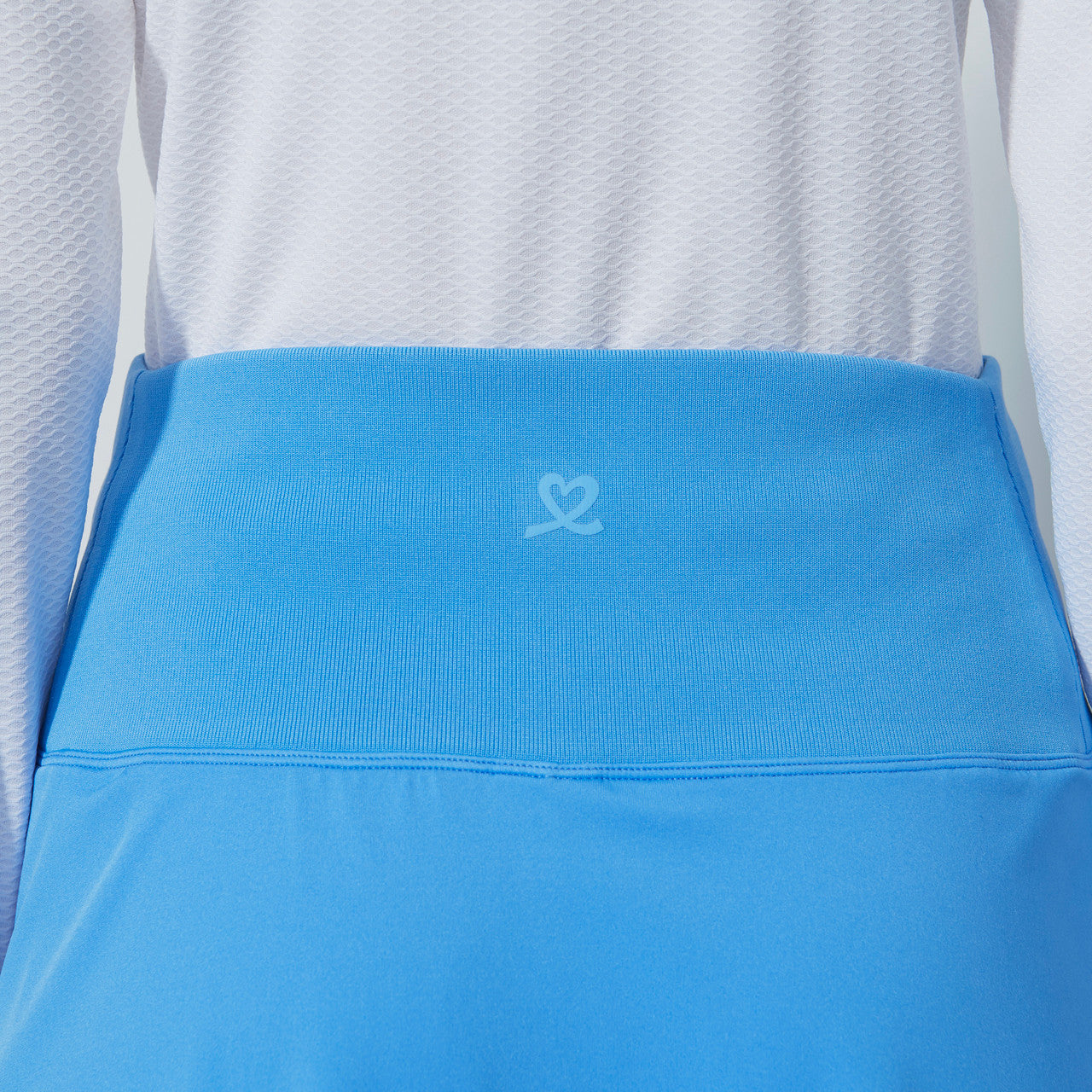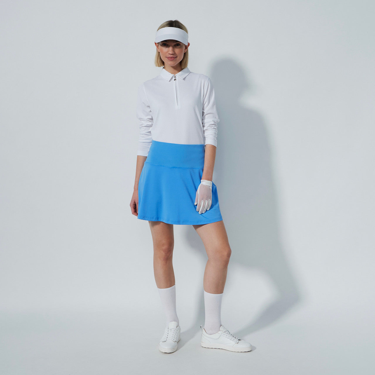 This skort is a feminine golf skirt that is slightly flared. It is made from stretch jersey fabric and has a ribbed waistband with support. The quick-dry, functional fabric conceals a pair of inner shorts that allow complete freedom of movement and provide leg pockets.