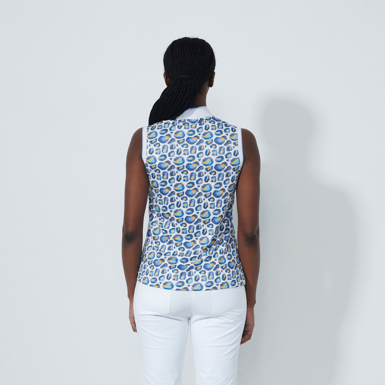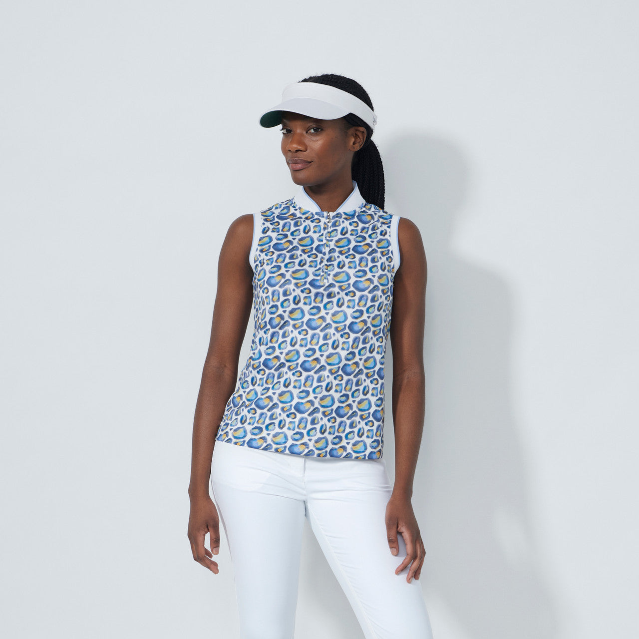 This Printed sleeveless golf top is made from a fully printed, Quick Dry material. The half-zip front and striped rib details at the collar and armholes create a modern, athletic edge, while the sleeveless cut offers complete freedom of movement.