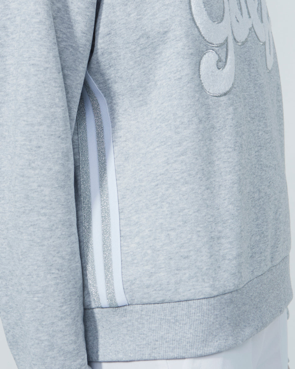Gray sweatshirt with a brand logo on a light gray background