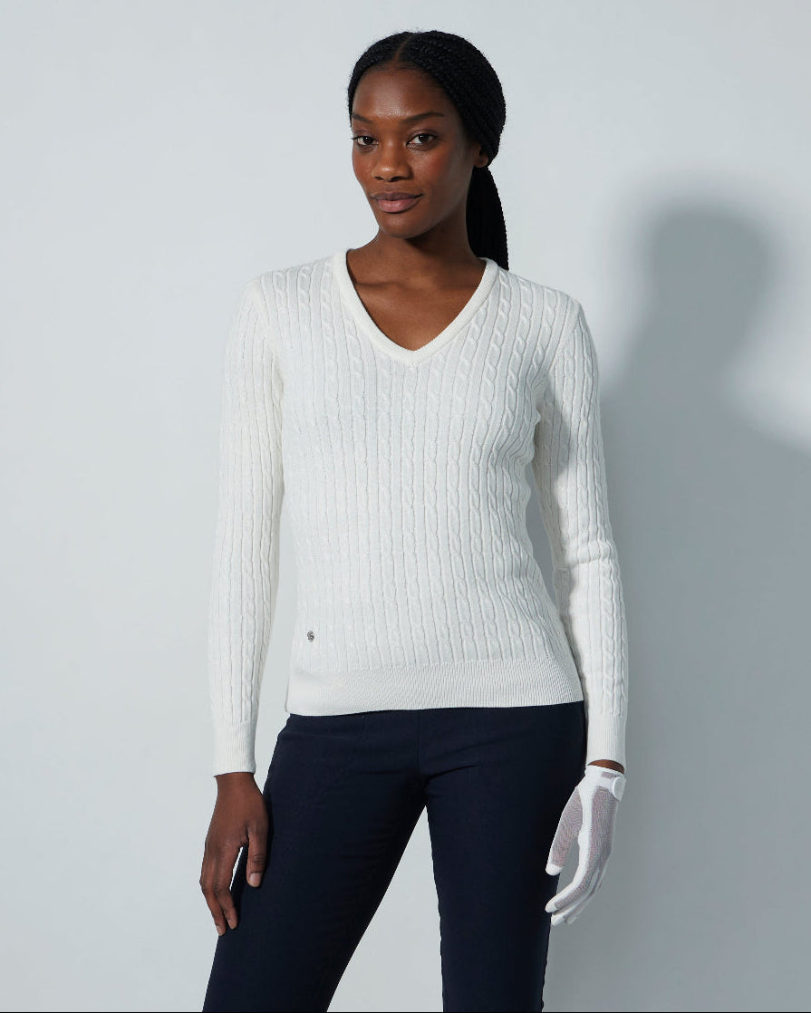 Madelene White Cable Knit V-Neck Sweater