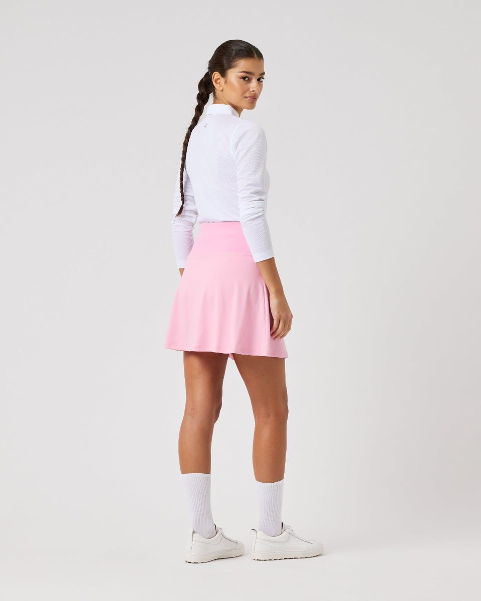 This skort is a feminine golf skirt that is slightly flared. It is made from stretch jersey fabric and has a ribbed waistband with support. The quick-dry, functional fabric conceals a pair of inner shorts that allow complete freedom of movement and provide leg pockets.